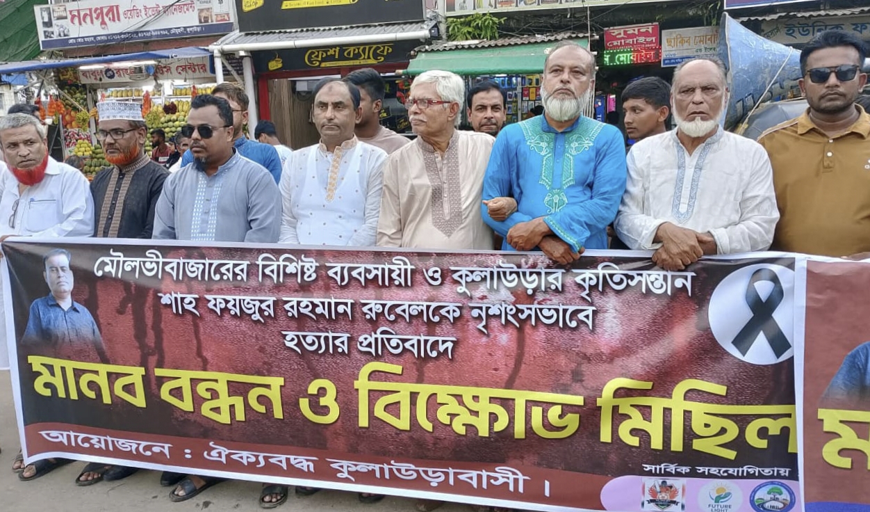 ব্যবসায়ী রুবেল হত্যার বিচারের দাবিতে কুলাউড়ায় মানববন্ধন ও বিক্ষোভ মিছিল